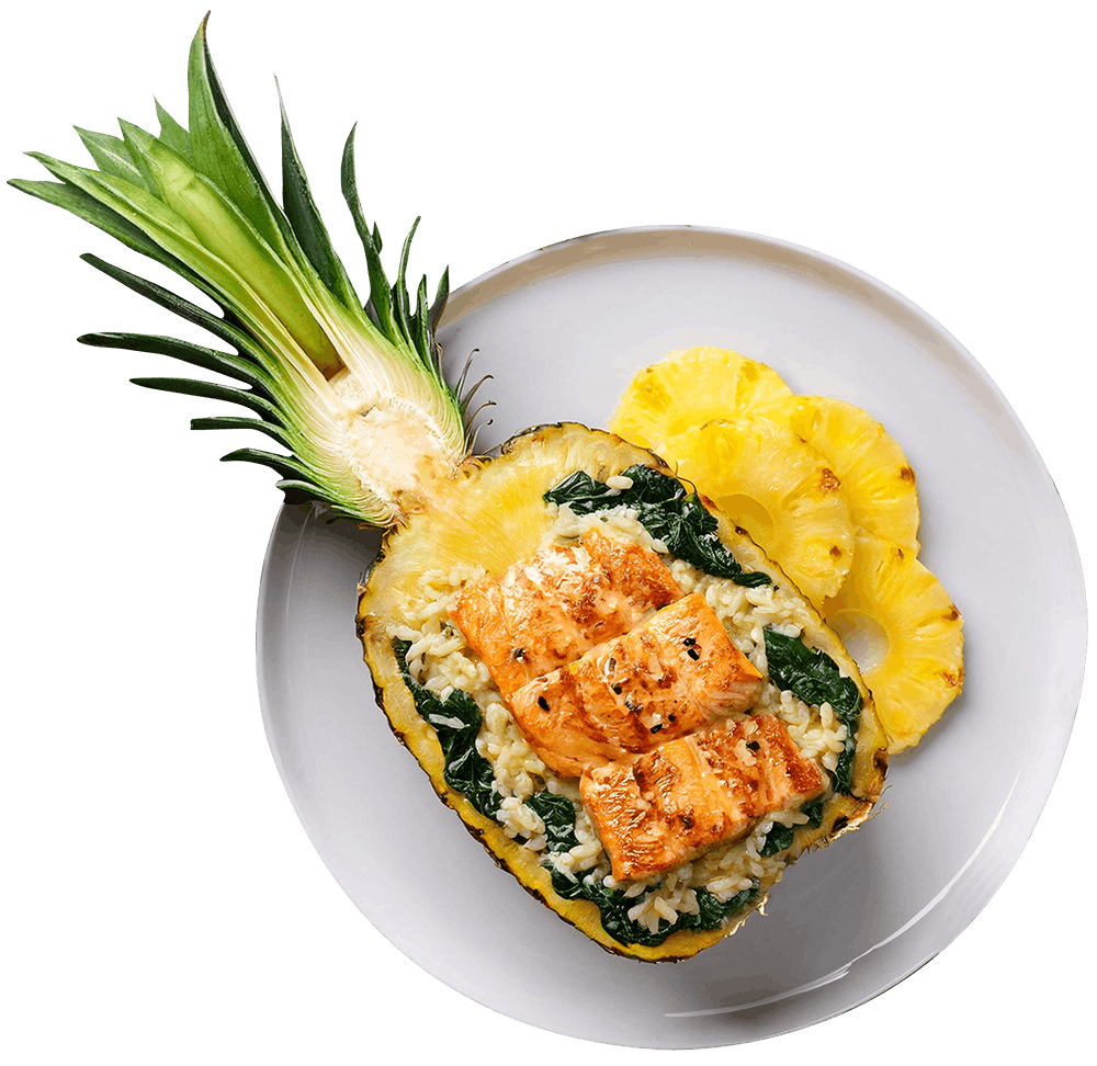 potato crusted salmon over fresh herb risotto & spinach, drizzled with pineapple sauce, served in a pineapple bowl.