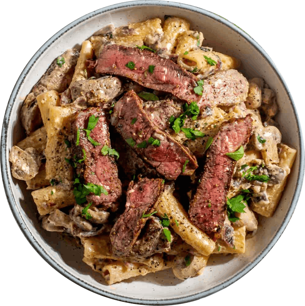 rigatoni with mushrooms, baby spinach in a creamy mushroom sauce topped with skirt steak & crumbled gorgonzola cheese.