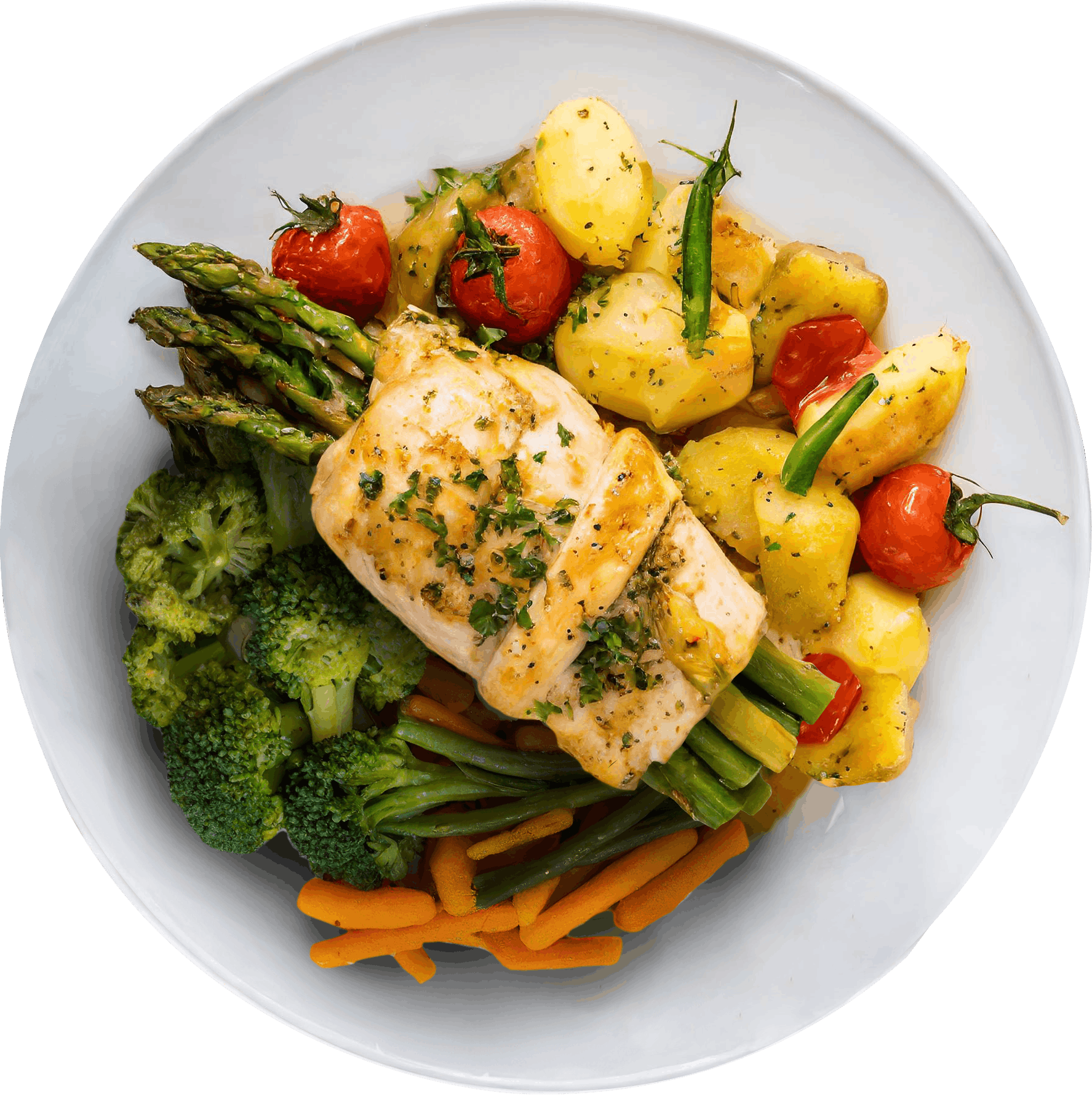 rolled & stuffed with asparagus in a white wine sauce, finished with breadcrumbs. served with farm fresh vegetables & roasted potatoes.