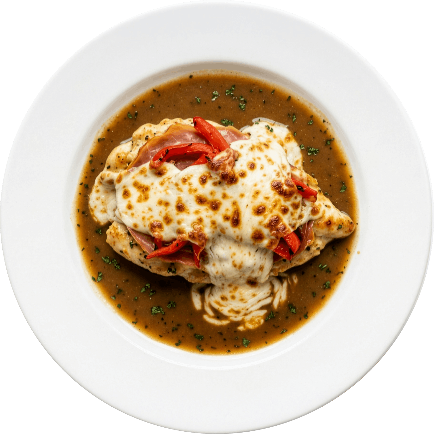 chicken breast sautéed in a brown sauce, topped with prosciutto, fresh melted mozzarella & roasted red peppers served with farm fresh vegetables & roasted potatoes.