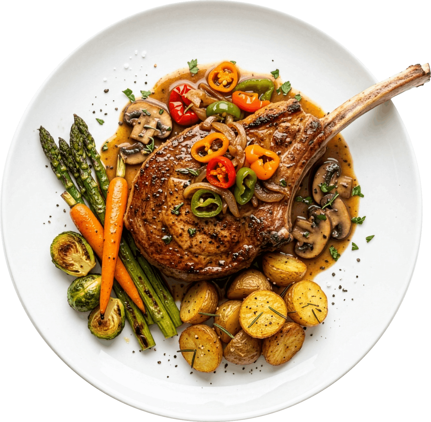 double-cut with hot & sweet cherry peppers, served in a balsamic reduction or a mushroom marsala sauce. served with farm fresh vegetables & roasted potatoes.
