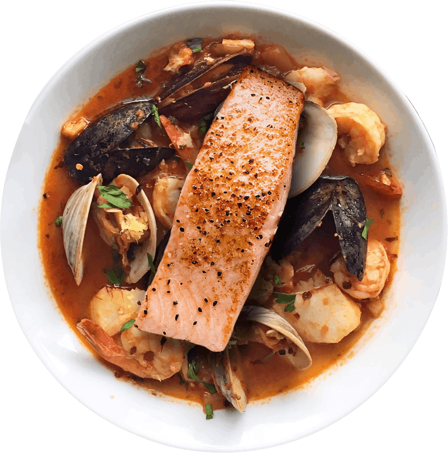served in a tomato & white wine sauce with spinach, shrimp, clams & mussels, finished with fresh herbs.
