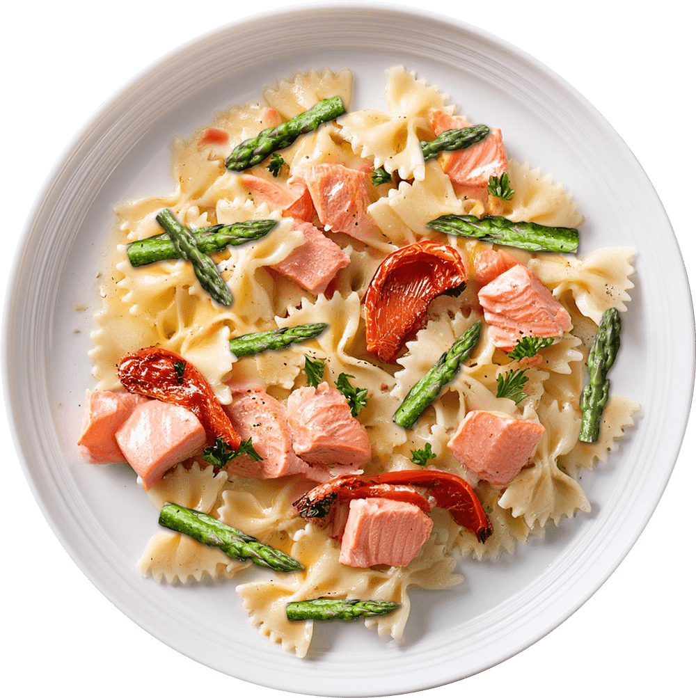 Farfalle pasta paired with smoked salmon, green peas & roasted peppers in a light creamy pink sauce.