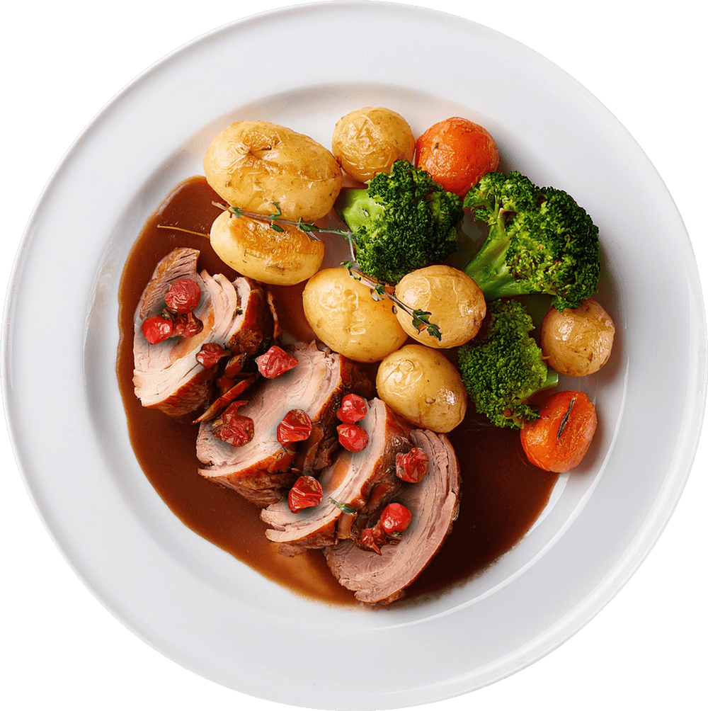 Pan seared, finished with hot & sweet cherry peppers, balsamic reduction served with fresh farm vegetables and roasted potatoes.
