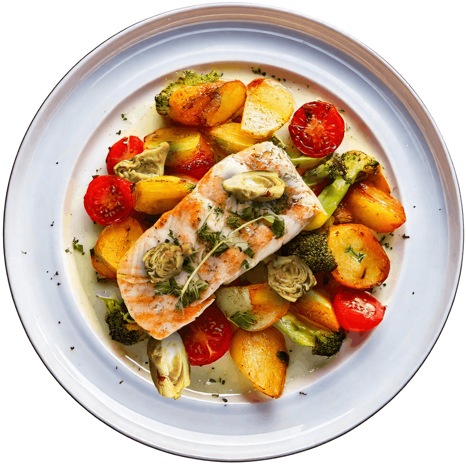 sautéed with cherry tomatoes & artichoke hearts in a white lemon sauce. served with farm fresh vegetables & potato croquettes.